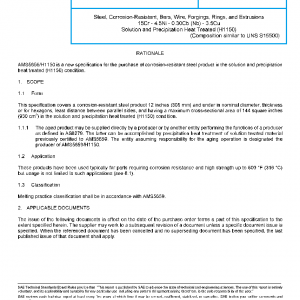 This specification covers a corrosion-resistant steel product 12 inches (305 mm) and under in nominal diameter, thickness or for hexagons, least distance between parallel sides, and having a maximum cross-sectional area of 144 square inches (930 cm2) in the solution and precipitation heat treated (H1150) condition.