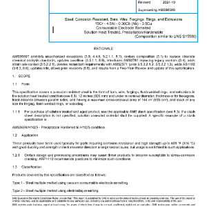 This specification covers a corrosion resistant steel in the form of bars, wire, forgings, flash welded rings, and extrusions in the solution heat treated condition (see 8.3), 12 inches (305 mm) and under in nominal diameter, thickness or for hexagons, least distance between parallel sides, and having a maximum cross-sectional area of 144 in2 (930 cm2), and stock of any size for forging, flash welded rings, or extruding.