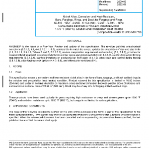 This specification covers a corrosion- and heat-resistant nickel alloy in the form of bars, forgings, and flash welded rings in the solution and precipitation heat treated condition. Product covered by this specification is limited to 10.00 inches (254 mm) and under in nominal diameter or maximum cross-sectional dimension between parallel sides (thickness) and nominal cross sectional area of 78.54 in2 (503 cm2). Stock may be of any size for forging or flash welded rings.