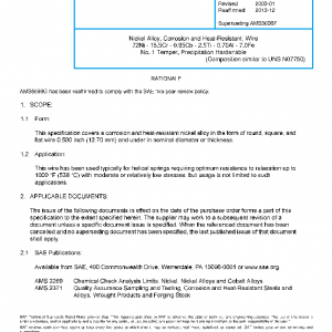 This specification covers a corrosion and heat-resistant nickel alloy in the form of round, square, and flat wire 0.500 inch (12.70 mm) and under in nominal diameter or thickness.