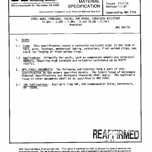 This specification covers a corrosion resistant steel in the form of bars, wire, forgings, mechanical tubing, extrusions, flash welded rings, and stock for forging or flash welded rings.