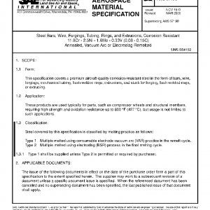 This specification covers a premium aircraft-quality corrosion-resistant steel in the form of bars, wire, forgings, mechanical tubing, flash welded rings, extrusions, and stock for forging, flash welded rings, or extruding.