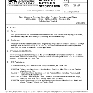 This specification covers a corrosion resistant steel in the form of bars, wire, forgings, extrusions, flash welded rings, and stock for forging, extruding, or flash welded rings.