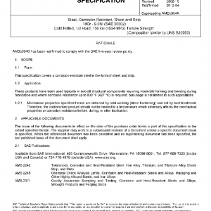 Steel, Corrosion-Resistant, Sheet and Strip 18Cr – 9.0Ni (SAE 30302) Cold Rolled, 1/2 Hard, 150 ksi (1034 MPa) Tensile Strength