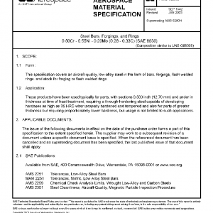 This specification covers an aircraft-quality, low-alloy steel in the form of bars, forgings, flash welded rings, and stock for forging or flash welded rings.