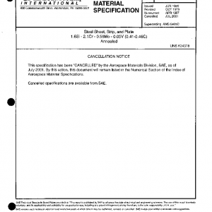 Primarily for heat treated parts and structures that may require welding during fabrication and may be through-hardened to a minimum tensile strength of 270,000 psi (1862 MPa) in sections of 2 in. (50 mm) or less in nominal thickness. This specification has been declared “Noncurrent” by the Aerospace Materials Division, SAE, as of April 1, 1987. It is recommended that this specification not be specified for new designs.