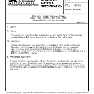 This specification covers a premium aircraft-quality, low-alloy steel in the form of bars, forgings, mechanical tubing, flash welded rings, and stock for forging or flash welded rings.