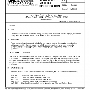 This specification covers an aircraft-quality, low-alloy steel in the form of bars, forgings, mechanical tubing, flash welded rings, and stock for forging or flash welded rings.