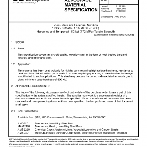 This specification covers an aircraft-quality, low-alloy steel in the form of heat treated bars and forgings, and of forging stock.