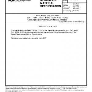 This specification has been declared “NONCURRENT” by the Aerospace Materials Division, SAE, as of September 1996. It is recommended, therefore, that this specification not be specified for new designs.This specification covers a premium aircraft-quality, low-alloy steel in the form of sheet, strip, and plate. These products have been used typically for parts, such as pressure vessels, requiring through-hardening to high strength levels and where such parts may require welding during fabrication, but usage is not limited to such applications.
