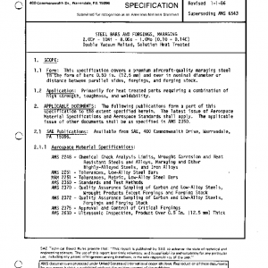 This specification covers a premium aircraft-quality maraging steel in the form of bars 0.50 in. (12.5 mm) and over in nominal diameter or distance between parallel sides, forgings, and forging stock.