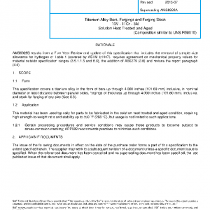 This specification covers a titanium alloy in the form of bars up through 4.000 inches (101.60 mm) inclusive, in nominal diameter or least distance between parallel sides, forgings of thickness up through 4.000 inches (101.60 mm), inclusive, and stock for forging of any size (See 8.6).