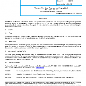 This specification covers a titanium alloy in the form of bars and forgings 14.000 inches (355.60 mm) and under in nominal diameter or least distance between parallel sides and stock for forging (see 8.6).