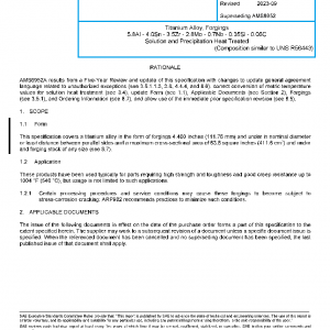 This specification covers a titanium alloy in the form of forgings 4.400 inches (111.76 mm) and under in nominal diameter or least distance between parallel sides and a maximum cross-sectional area of 63.8 square inches (411.6 cm2) and under and forging stock of any size (see 8.7).