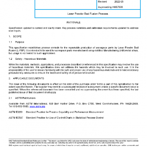 This specification establishes process controls for the repeatable production of aerospace parts by Laser Powder Bed Fusion (L-PBF). It is intended to be used for aerospace parts manufactured using Additive Manufacturing (AM) metal alloys, but usage is not limited to such applications.