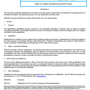 This specification establishes process controls for the repeatable production of sintered parts by binder jet additive manufacturing (BJAM). It is primarily intended to be used to manufacture metallic or ceramic aerospace parts, but usage is not limited to such applications.