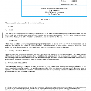This specification covers an acrylonitrile-butadiene (NBR) rubber in the form of molded rings, compression seals, molded O-ring cord, and molded-in-place gaskets for aeronautical and aerospace applications. For sheet, strip, tubing, extrusions, and molded shapes, refer to the AMS3215 specification, which is intended for that use.