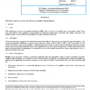 This specification covers an acrylonitrile-butadiene (NBR) rubber in the form of molded rings, compression seals, O-ring cord, and molded-in-place gaskets for aeronautical and aerospace applications. For sheet, strip, tubing, extrusions, and molded shapes, use the AMS3XXX specification which is intended for that use.