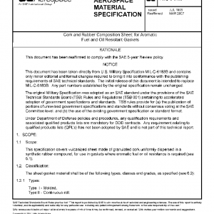 This specification covers vulcanized sheet made of granulated cork uniformly dispersed in a synthetic rubber compound, for use in gaskets where aromatic fuel or oil resistance is required (see 6.1).