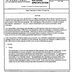 This specification covers the requirements for heat-treatment of four classes of steel (see 1.2) and the requirements for furnace equipment, test procedures and information for heat-treating procedures, heat-treating temperatures and material (see 6.11) test procedures. It is applicable to all heat treatment of parts and to only the heat treatment of mill products which could affect its fabricability or the properties of parts. This specification also describes procedures which, when followed, will produce the desired properties and material qualities within the limitations of the respective alloys tabulated in Tables IA, IB, IC and ID. Alloys other than those specifically covered herein may be heat treated using all applicable requirements of this specification.
