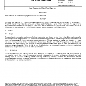 This specification covers the requirements for heat-treatment of four classes of steel (See 1.2) and the requirements for furnace equipment, test procedures and information for heat-treating procedures, heat-treating temperatures and material (See 6.3) test procedures. This specification is applicable only to the heat treatment of raw material (See 6.3.1); it does not cover the requirements for the heat treatment of steel parts (See 3.4 and 6.3.2). This specification also describes procedures that, when followed, will produce the desired properties and material qualities within the limitations of the respective alloys tabulated in Tables 1A, 1B, 1C and 1D. Alloys other than those specifically covered herein may be heat treated using all applicable requirements of this specification.