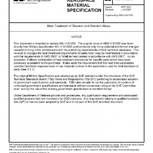 This specification covers the heat treatment of titanium and titanium alloy mill products (raw material), including wrought and cast products, by material producers. This specification also covers furnace equipment requirements, test procedures, and general information for heat treating procedures, heat treating temperatures, and material test procedures for the heat treatment of titanium and titanium alloys. It also describes procedures which, when followed, have produced the desired properties within the limitations of the respective alloys.