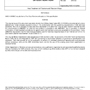 This specification covers the heat treatment of titanium and titanium alloy mill products (raw material), including wrought and cast products, by material producers. This specification also covers furnace equipment requirements, test procedures, and general information for heat treating procedures, heat treating temperatures, and material test procedures for the heat treatment of titanium and titanium alloys. It also describes procedures that, when followed, have produced the desired properties within the limitations of the respective alloys.