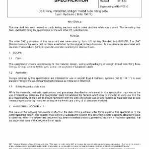 This specification covers requirements for the material, design, testing and packaging of straight thread tube fitting boss O-rings. O-rings covered by this specification are acrylonitrile-butadiene rubber.