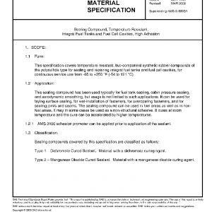 This specification covers temperature resistant, two-component synthetic rubber compounds of the polysulfide type for sealing and repairing integral fuel tanks and fuel cell cavities, for continuous service use from −65 to +250 °F (−54 to 121 °C).