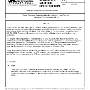 This specification covers pressure sensitive adhesive tape designed for masking and color separation application during aircraft painting operations. It is designed for use with all common finishes but is especially designed for use with polyurethane coating systems conforming to MIL-C-83286.