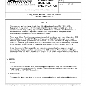 This specification establishes requirements for plastic convoluted tubing that provides mechanical protection and support for electric wire bundles. The continuous operating temperatures range from -67°F (-55°C) to 500°F (260°C) (see 6.1).