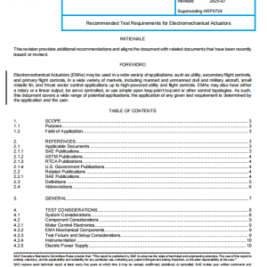 This Aerospace Recommended Practice (ARP) provides recommended requirements for the testing of electromechanical actuators (EMAs). General test considerations are also provided. While many EMA configurations include motor control electronics, the specific tests required for the electronic hardware, software, or firmware are outside the scope of this document.