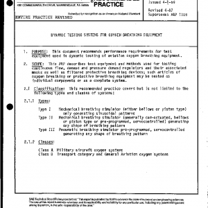 This ARP describes test equipment and methods used for testing continuous flow, demand and pressure demand regulators and their associated masks as well as filtered protective breathing devices; such articles of oxygen breathing or protective breathing equipment may be tested as individual components or as a complete system.