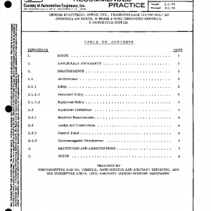 This Recommended Practice outlines the electrical performance characteristics for a continuous duty, diesel or gasoline engine driven brushless alternator unit for supplying 400-Hertz electrical power to commercial transport aircraft. It is intended to assist the airlines in standardizing recommendations for various sizes and configurations of equipment and it is a guide for the preparation of detailed specifications. The unit is primarily intended to supply power to the aircraft during passenger loading and unloading, and during servicing operations. The combination of the equipment specified herein and the interconnecting cables(s) between the 400-Hertz alternator and the aircraft shall provide power characteristics at the aircraft receptacle which meet MIL-STD-704 requirements for Category “B” equipment. Other limits which are necessary to meet specific conditions must be specified by the purchaser.