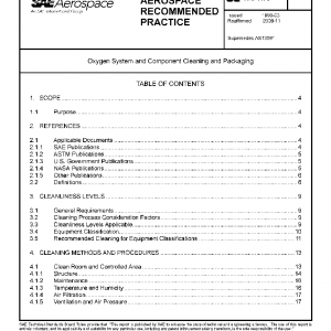 This SAE Aerospace Recommended Practice (ARP) provides recommended practices for cleaning aircraft oxygen equipment such as tubing, pieces parts (including regulator and valve parts), cylinders and ground-based equipment that may be used to support aircraft oxygen systems. These methods may apply to gaseous and liquid oxygen equipment. This document specifies work area details, methods to select suitable cleaning chemicals, cleaning methods, test methods to verify cleanliness level, and methods of packaging the components and parts after cleaning. Person designated to clean oxygen equipment should be qualified and trained to clean oxygen equipment. Cleanliness levels achieved are strongly dependent on the capabilities of the persons performing the cleaning operation.