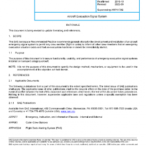 This SAE Aerospace Recommended Practice recommends general criteria for the development and installation of an aircraft emergency signal system to permit any crew member (flight or cabin) to inform all other crew members that an emergency evacuation situation exists and that an evacuation has been or should be immediately started.