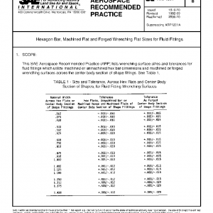 This SAE Aerospace Recommended Practice (ARP) lists wrenching surface sizes and tolerances for fluid fittings which utilize machined or unmachined hex bar dimensions and machined or forged wrenching surfaces across the center body section of shape fittings. See Table 1.