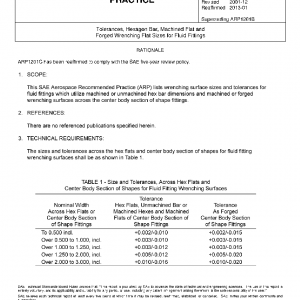 This SAE Aerospace Recommended Practice (ARP) lists wrenching surface sizes and tolerances for fluid fittings which utilize machined or unmachined hex bar dimensions and machined or forged wrenching surfaces across the center body section of shape fittings.