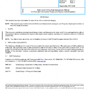This document establishes standard gland design criteria and dimensions for static axial O-ring seal applications without anti-extrusion devices specifically for engines and engine control systems operating at a maximum pressure of 1500 psi (10345 kPa).
