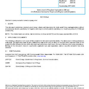 This document establishes standard gland design criteria and dimensions for static axial O-ring seal applications without anti-extrusion devices specifically for engines and engine control systems operating at a maximum pressure of 1500 psi (10345 kPa).