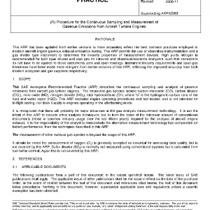This SAE Aerospace Recommended Practice (ARP) describes the continuous sampling and analysis of gaseous emissions from aircraft gas turbine engines. The measured gas species include carbon monoxide (CO), carbon dioxide (CO2), nitric oxide (NO), nitrogen dioxide (NO2), total hydrocarbons (CHα where “α” is the hydrogen to carbon ratio of the fuel) and water vapor (H2O). This ARP excludes engine operating procedures and test modes, and is not intended for in-flight testing, nor does it apply to engines operating in the afterburning mode.