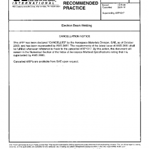 This Aerospace Recommended Practice (ARP) describes techniques recommended for use in producing electron beam welded joints in materials commonly employed in the aerospace industry. The guidelines described herein are oriented toward the use of welding equipment capable of maintaining the workpiece at pressure levels of 1 x 10(sup)-4 Torr (133 x 10(sup)-4 Pa) or lower during welding.