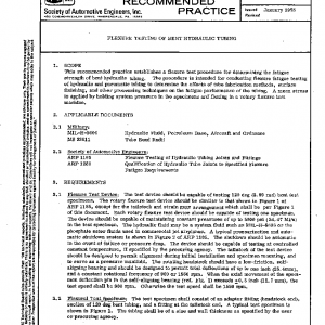 This recommended practice establishes a flexure test procedure for determining the fatigue strength of bent hydraulic tubing. The procedure is intended for conducting flexure fatigue testing of hydraulic and pneumatic tubing to determine the effects of tube fabrication methods, surface finishing, and other processing techniques on the fatigue performance of the tubing. A mean stress is applied by holding system pressure in the specimens and flexing in a rotary flexure test machine.