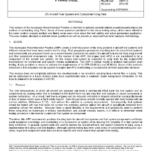 This Aerospace Recommended Practice (ARP) covers a brief discussion of the icing problem in aircraft fuel systems and different means that have been used to test for icing. Fuel preparation procedures and icing tests for aircraft fuel systems and components are proposed herein as a recommended practice to be used in the aircraft industry for fixed wing aircraft and their operational environment only. In the context of this ARP, the engine (and APU) is not considered to be a component of the aircraft fuel system, for the engine fuel system is subjected to icing tests by the engine/APU manufacturer for commercial and specific military applications. This ARP is written mostly to address fuel system level testing. It also provides a means to address the requirements of 14 CFR 23.951(c) and 25.951(c). Some of the methods described in this document can be applied to engine and APU level testing or components of those application domains.