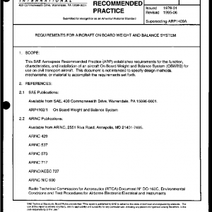 This SAE Aerospace Recommended Practice (ARP) establishes requirements for the function, characteristics, and installation of an aircraft On Board Weight and Balance System (OBWBS) for use on civil transport aircraft. This document is not intended to specify design methods, mechanisms, or material to accomplish the requirements set forth.