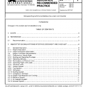 This SAE Aerospace Recommended Practice (ARP) provides a guide for the preparation of a Helicopter Engine/Airframe Interface Document and Checklist. This document and checklist is intended to provide complete relevant information on the characteristics, performance, and engine interfaces. Of most importance is the identification of the data and the location of data to assure that the engine manufacturer and the airframe manufacturer supply information that can be easily located by either manufacturer.