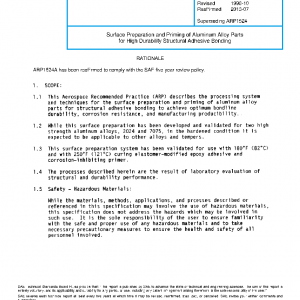 This Aerospace Recommended Practice (ARP) describes the processing system and techniques for the surface preparation and priming of aluminum alloy parts for structural adhesive bonding to achieve optimum bondline durability, corrosion resistance, and manufacturing producibility.