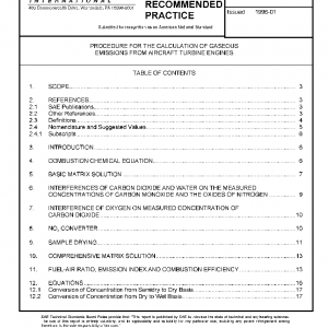 This is a procedure for calculation of gaseous emissions data, specifically, emission index, fuel-air ratio, and combustion efficiency for aircraft turbine engines based on the measurement of carbon monoxide, carbon dioxide, total hydrocarbons, and the oxides of nitrogen. Reference 2.1.1 gives procedures for the measurement of gaseous emissions from aircraft turbine engines.