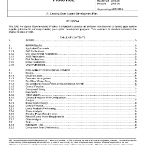 This SAE Aerospace Recommended Practice (ARP) is intended to document the process of landing gear system development. This document includes landing gear system development plans for commercial, military, fixed wing and rotary wing air vehicles.