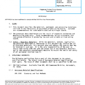 This document describes the materials, equipment, and processing techniques utilized in the fabrication of polyimide printed wiring boards. Included are recommendations for both double-sided and multilayer boards.